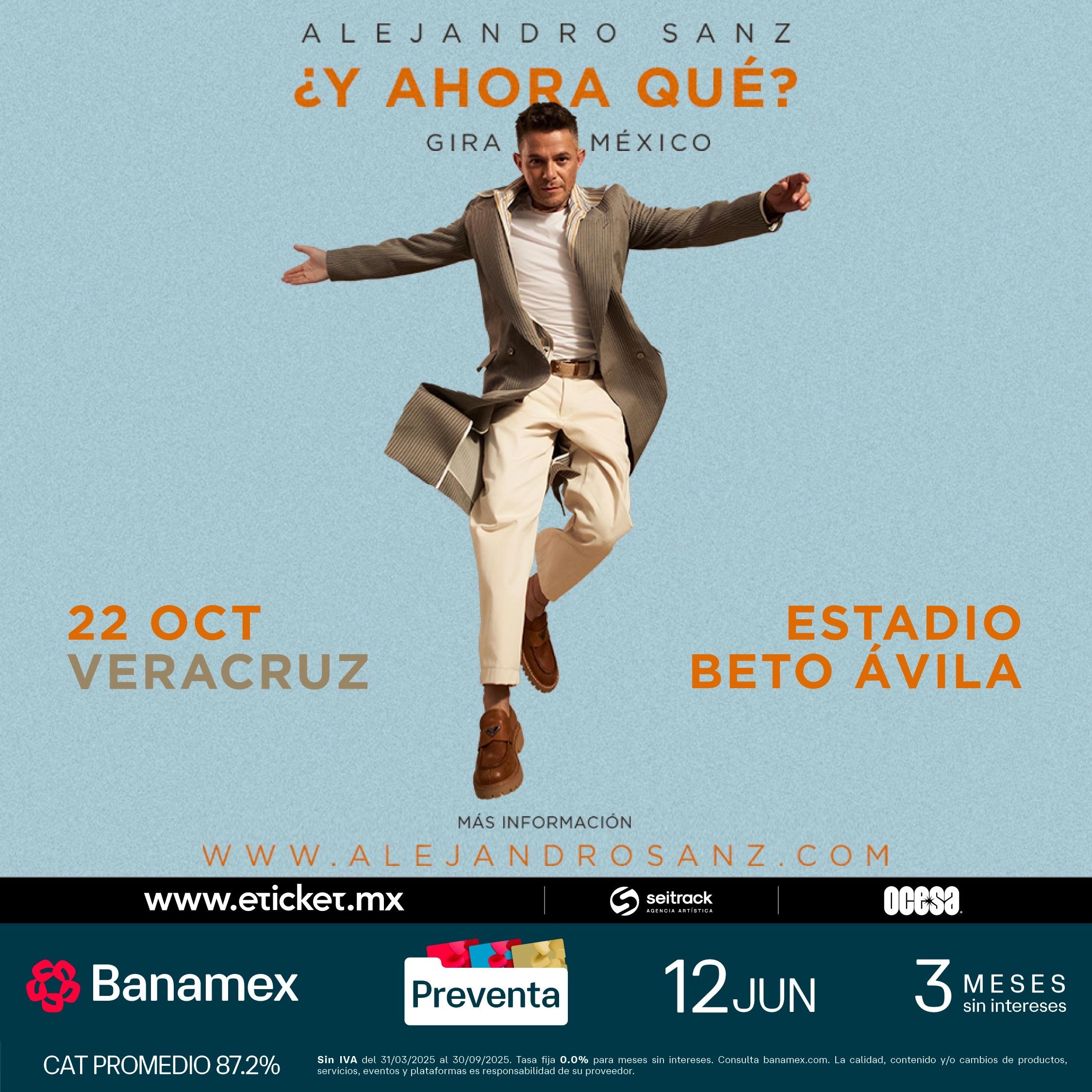 ¡Y es VERACRUZ!, una de las plazas en la que Alejandro Sanz presentará su nuevo tour ¿Y Ahora Qué? El miércoles 22 de octubre en el estadio de béisbol “Beto Ávila”.