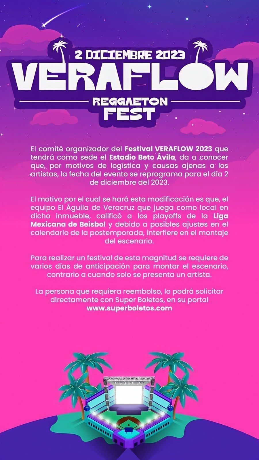 Veracruz, Ver. Agosto 2023.- El Comité Organizador del Festival VERAFLOW 2023 que tendrá como sede el estadio de béisbol “Beto Ávila” anuncia a la ciudadanía en general que por motivos de logística y causas ajenas a los artistas, la fecha del evento se reprograma para el sábado 2 de diciembre del presente año.