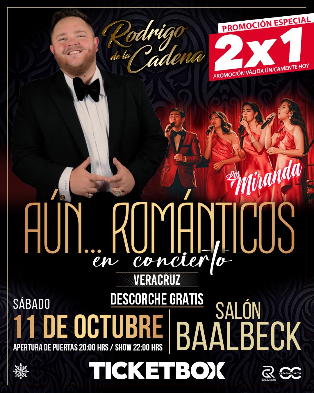 Los boletos para “Aún… Románticos” ya están disponibles a través de www.ticketbox.com.mx . No te pierdas esta oportunidad de revivir los clásicos del romanticismo y disfrutar de una noche llena de emoción y entrega con Rodrigo de la Cadena y el talento vocal de Los Miranda. Como artistas invitados el grupo veracruzano Bubu’s Band.